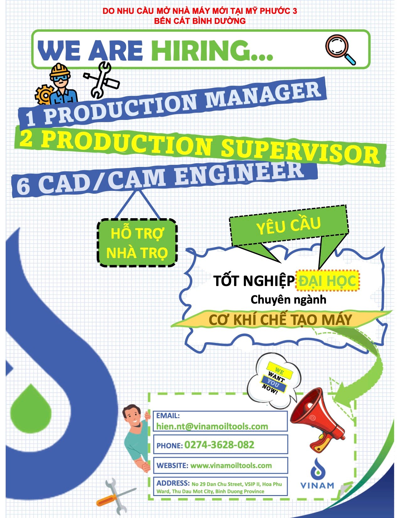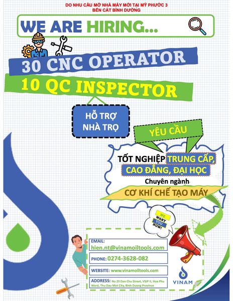 “Do nhu cầu mở nhà máy mới tại Mỹ Phước 3, Bến Cát, Bình Dương CÔNG TY CỔ PHẦN THIẾT BỊ DẦU KHÍ VIỆT MỸ cần tuyển các vị trí sau: