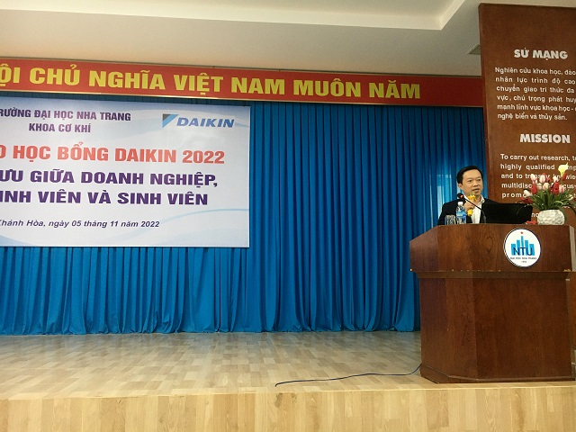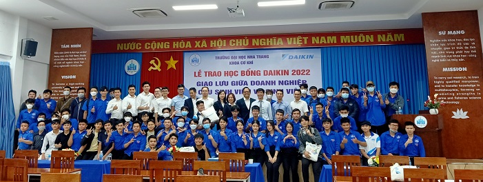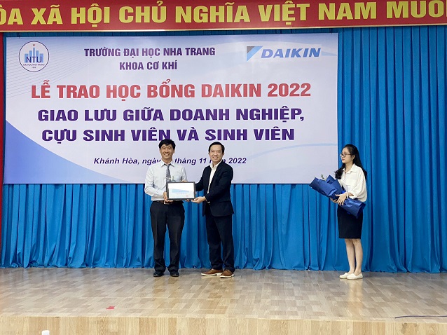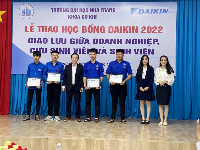 Ngày 05 tháng 11 năm 2022, Khoa Cơ khí kết hợp cùng với Công ty Daikin Việt Nam – Chi nhánh Khánh Hòa tổ chức Lễ trao học bổng cho sinh viên có kết quả học tập và rèn luyện tốt ngành Kỹ thuật nhiệt (04 suất học bổng, 05 triệu đồng/suất) và trao khoản hỗ trợ cho hoạt động nghiên cứu ngành Kỹ thuật nhiệt số tiền 20 triệu đồng. Đồng thời, Khoa và đại diện Công ty đã tổ chức buổi giao lưu giữa Cựu sinh viên và Sinh viên nhằm nâng cao các hiểu biết về ngành nghề, thông tin tuyển dụng, những kiến thức và kỹ năng cần thiết cho sinh viên.