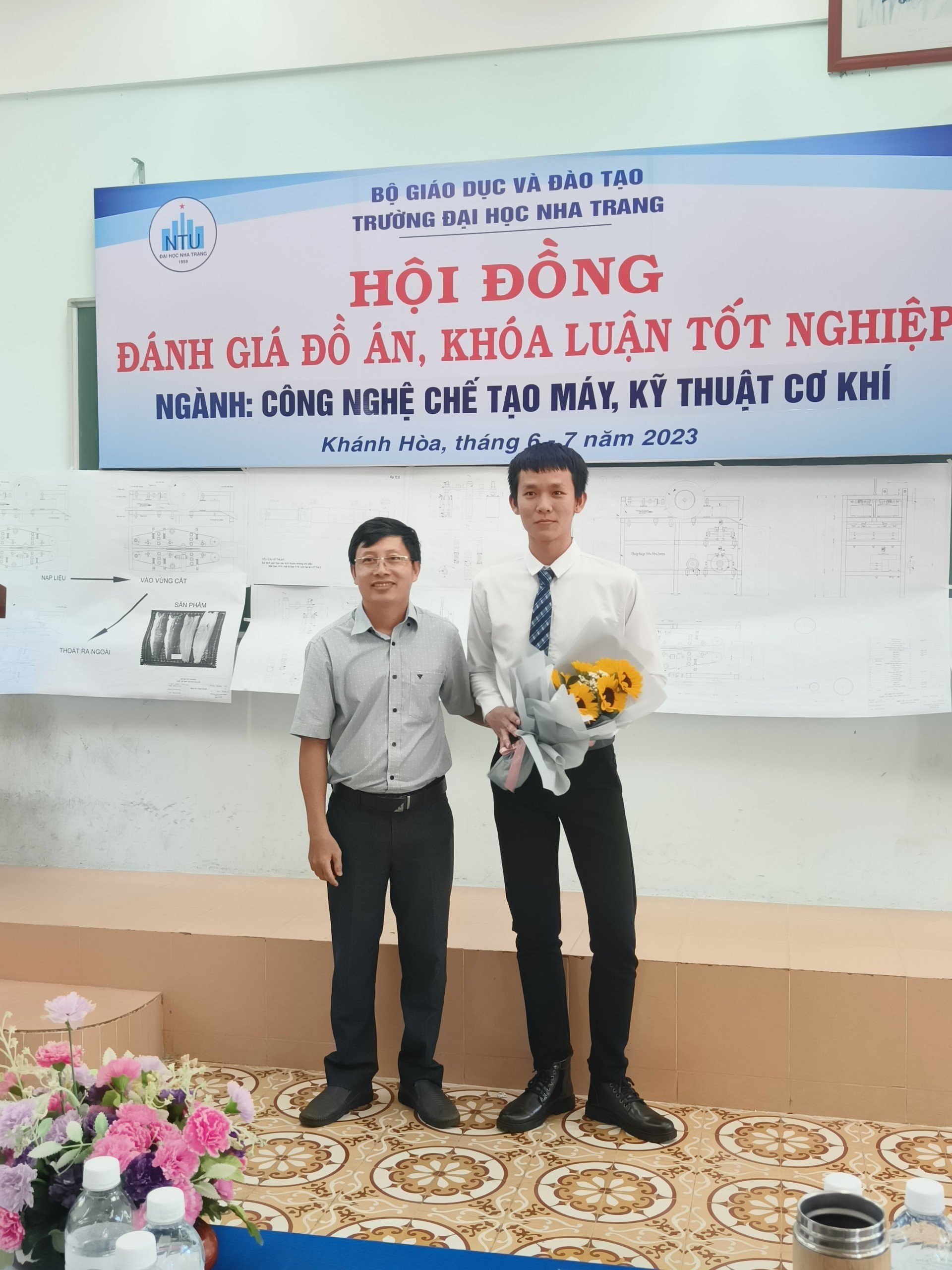 Hội đồng bảo vệ tặng hoa cho SV.