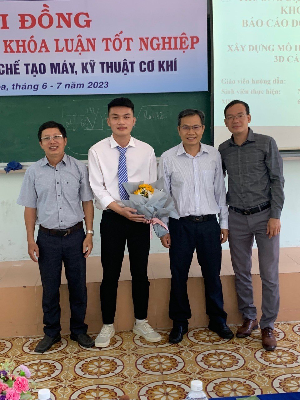 Sinh viên Nguyễn Trọng Hoàng cùng các thầy hội đồng bảo vệ đồ án.